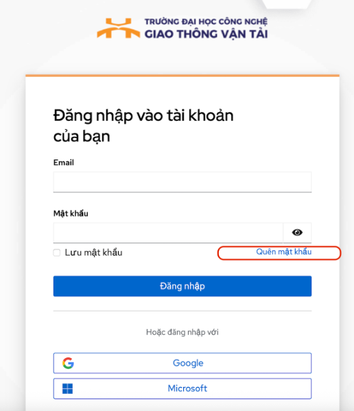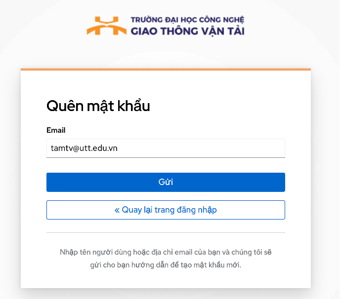 Nhấn Quên mật khẩu → nhập email @utt.edu.vn → chọn Gửi.